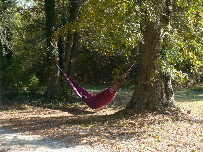 (Photos: Deep resting at The Stone House, top, and the morning light in the trees there, above.)