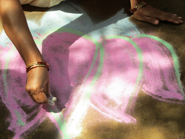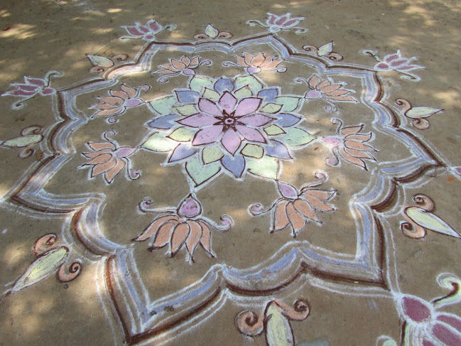 Kollam ground art, above, and Chitrama's lotus, below, by Jaya.