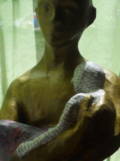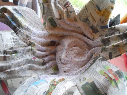 The third one is the one I am working on now. It is not finished. It is still just newspaper, layer upon layer and the face is formed using a paste made of shredded paper, which still needs lots of layers too.