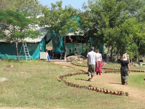 The hall at Anantha Niketan, on one of the retreats in Tiruvannamalai, above. Going into the hall, below, and lunch at Anaatha Niketan, below, all by Evan.