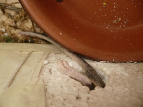 (Photos: One of the dormice, top, and below, one of the dormice trying to enter the polystyrene hideaway, by Jenny.)