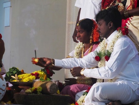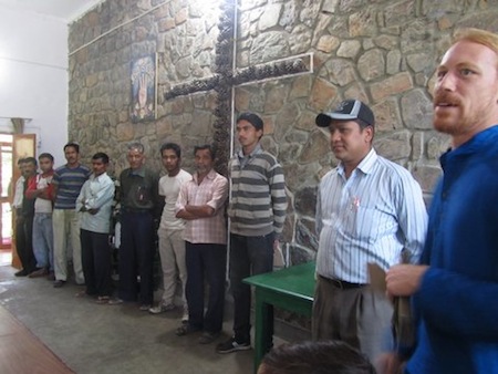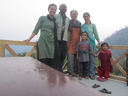 (Photos, from the top: Denis with the kids in Sattal, by Jaya; Sattal bed, by Tom; Jonathan and the group at Sattal, and Vijay and the gang, by Gemma; The Sattal retreat, by Tom; Chitra's wedding in Tiru, Jaya and Gemma dressed for the wedding, and the Anantha Niketan family, by Jaya. )