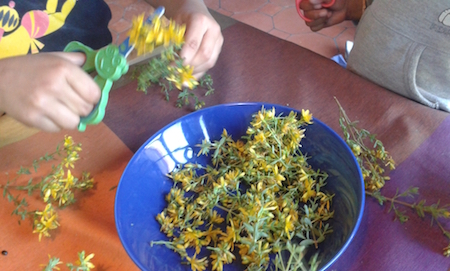 Summer is coming again to Dharmaloca, and with it the beautiful yellow flowers of Saint John's Wort. So we had a sweet morning picking flowers with Roz and then preparing them with the kids to macerate with almond oil.